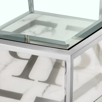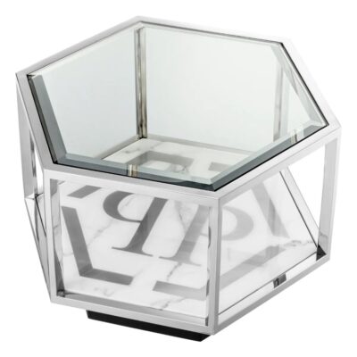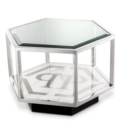 The compact hexagonal ‘Falcon View’ 60 x 40 cm coffee table with faux black marble with a gold trim is the perfect showcase for the PP logo. The decadent Italian style combined with the beveled top makes this coffee table party ready.