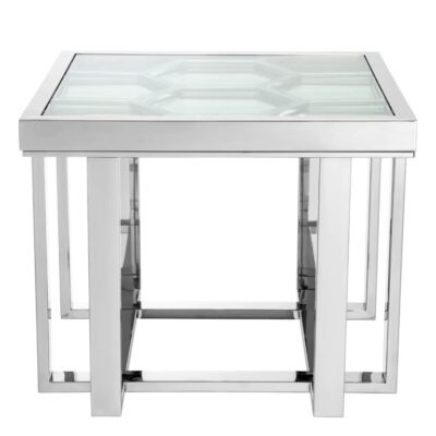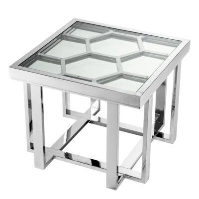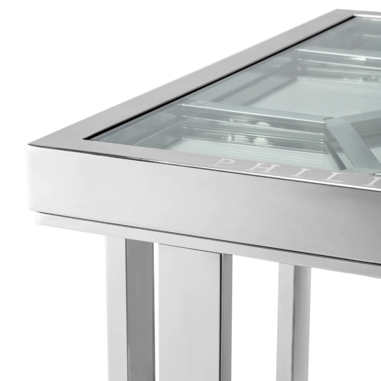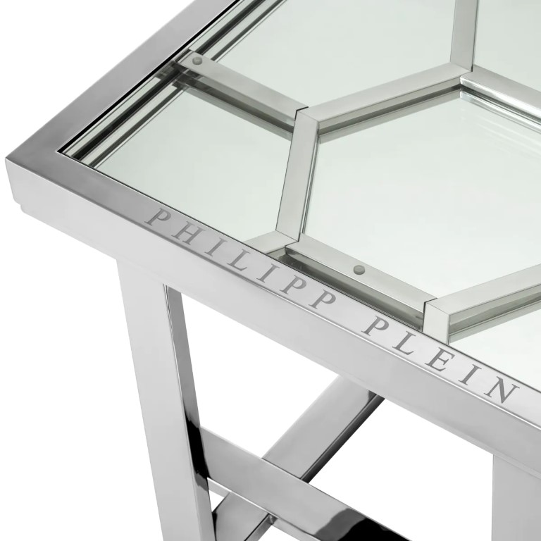 The 61 x 61 cm Skeleton side table with its intricate polished nickel geometric frame, glass top, hexagonal motif and Philipp Plein branding adds a contemporary and glitzy touch to luxury living.