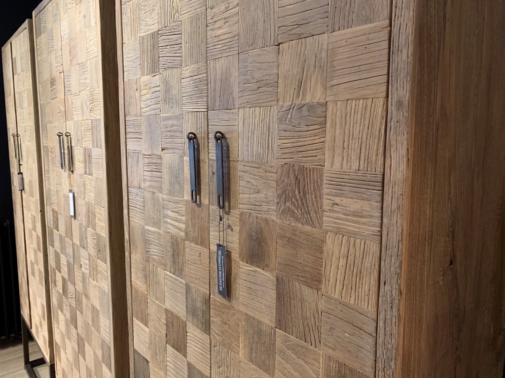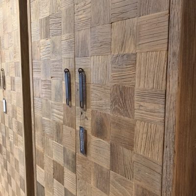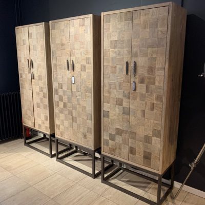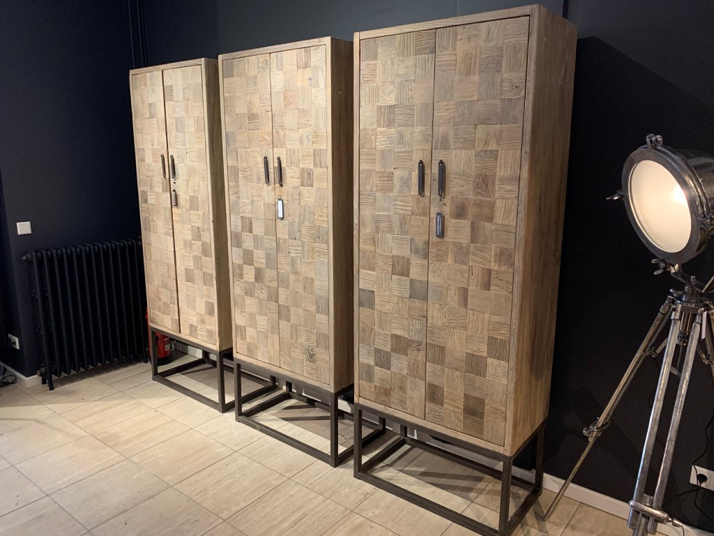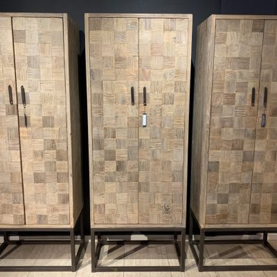 Elmwood cabinet with 2 checkered doors on a metal base.