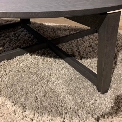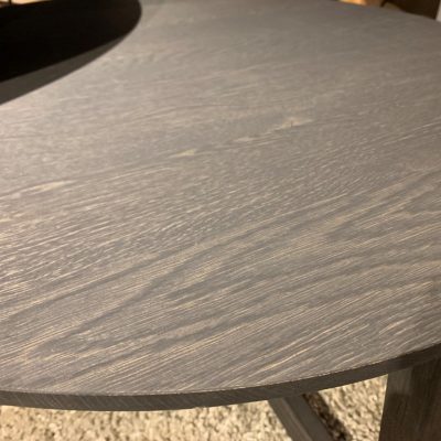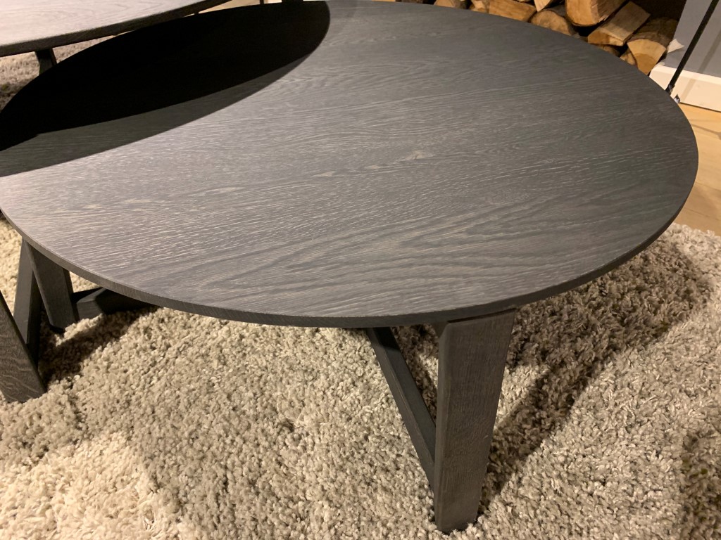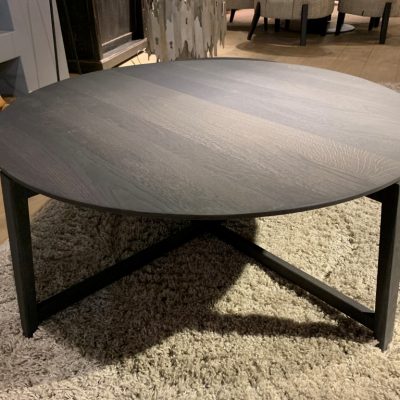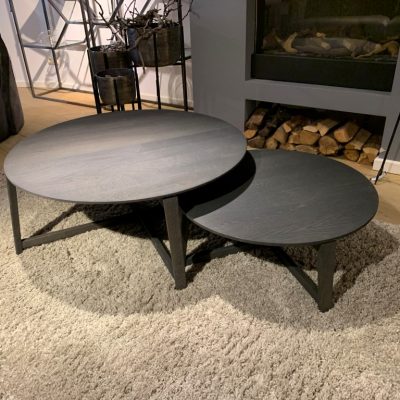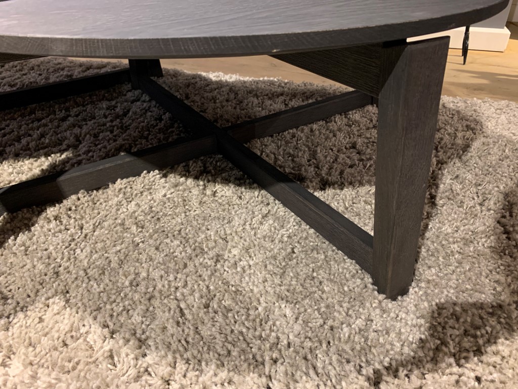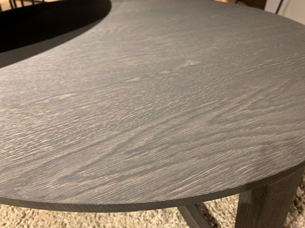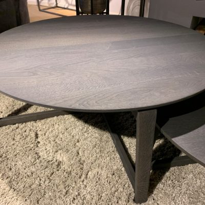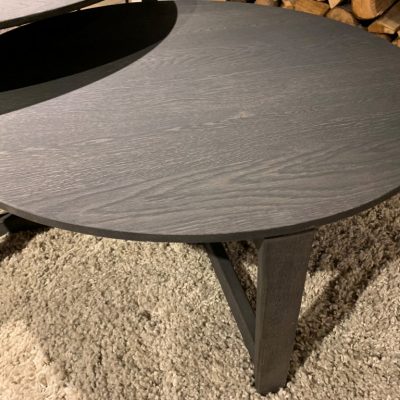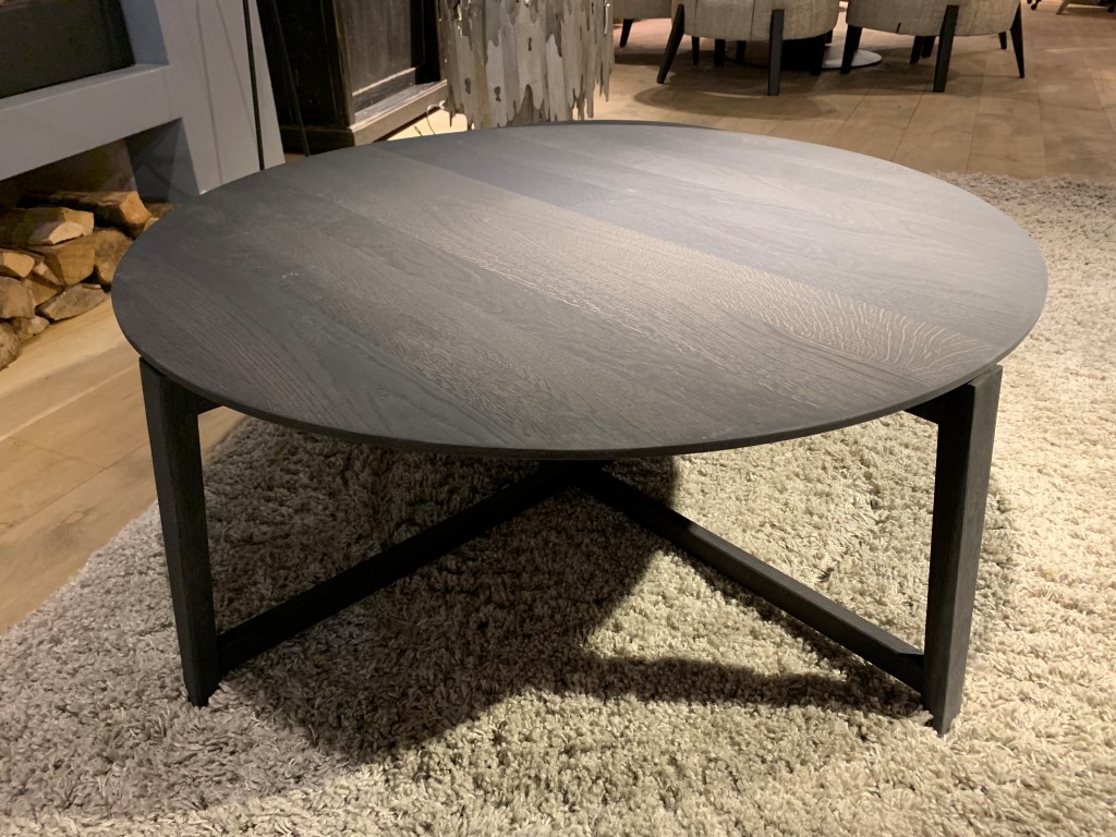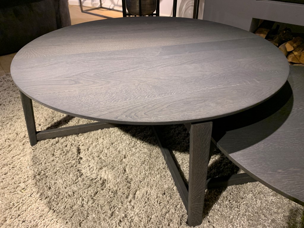 Coffee table Tube Ø75 cm, version low. A greyed oak coffee table with oak legs.