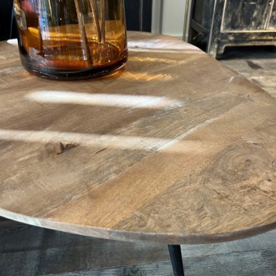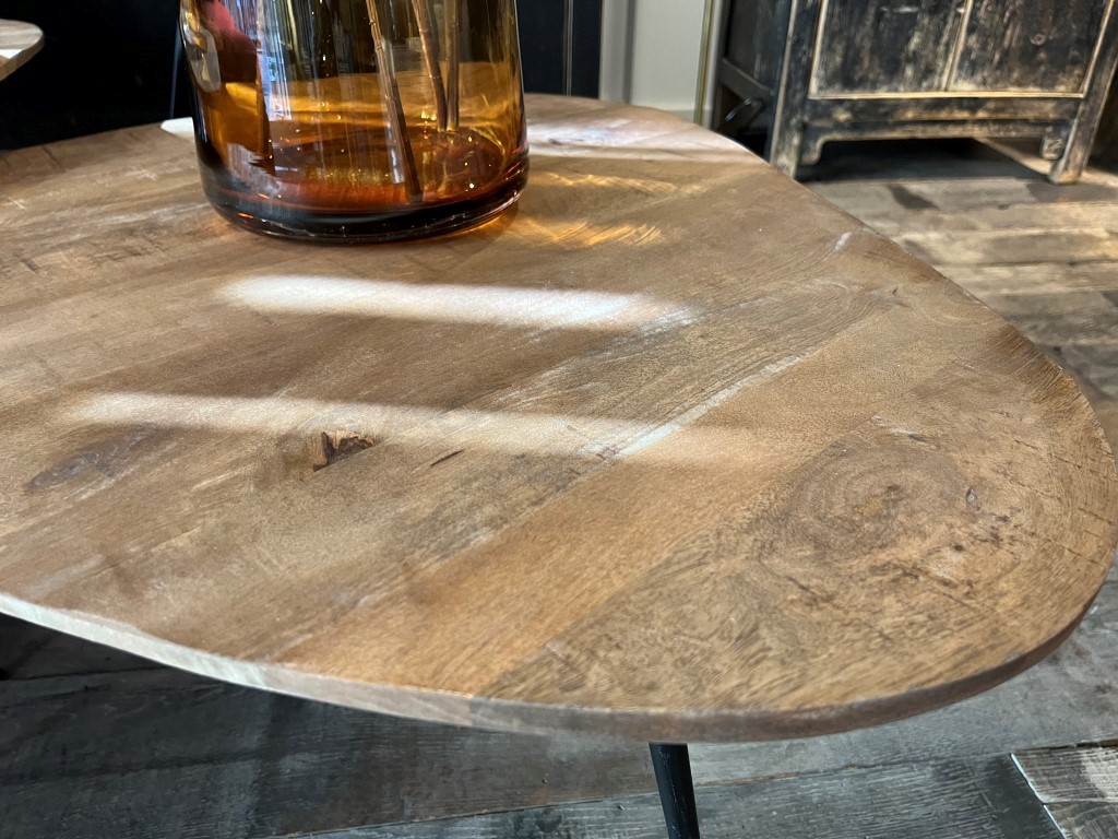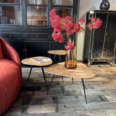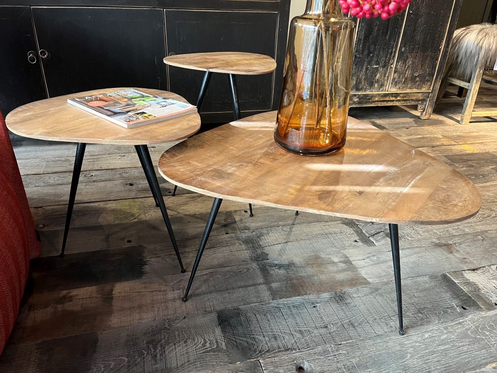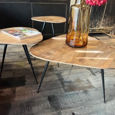 Set of 3 organically shaped tables made of mango wood. The tables all have a different height and stand on 3 metal pointed legs.