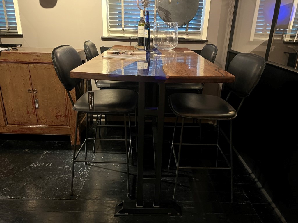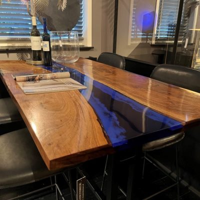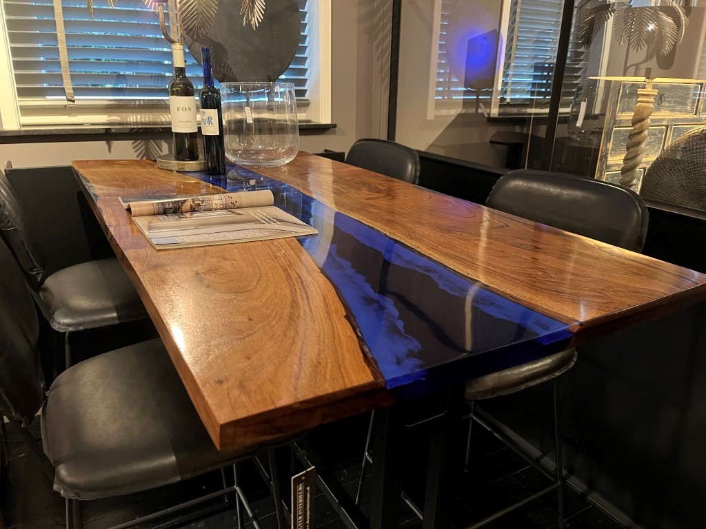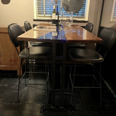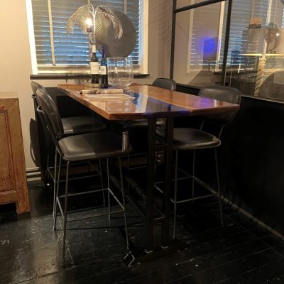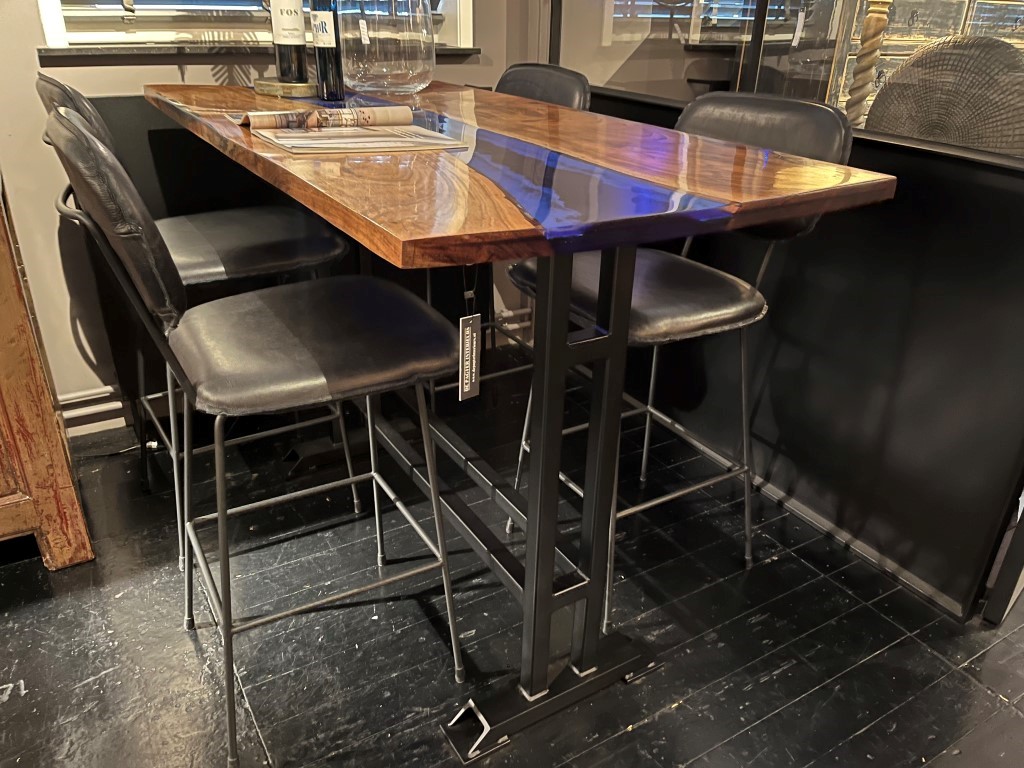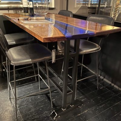 Bar table with a hardwood and epoxy table top. The base of the table is made of black powder-coated metal.