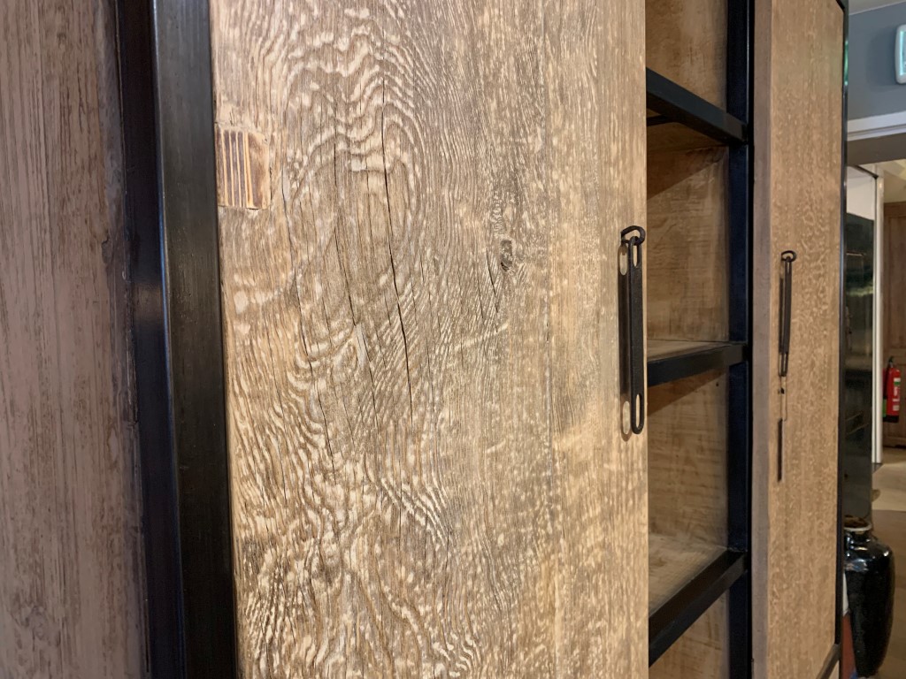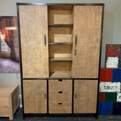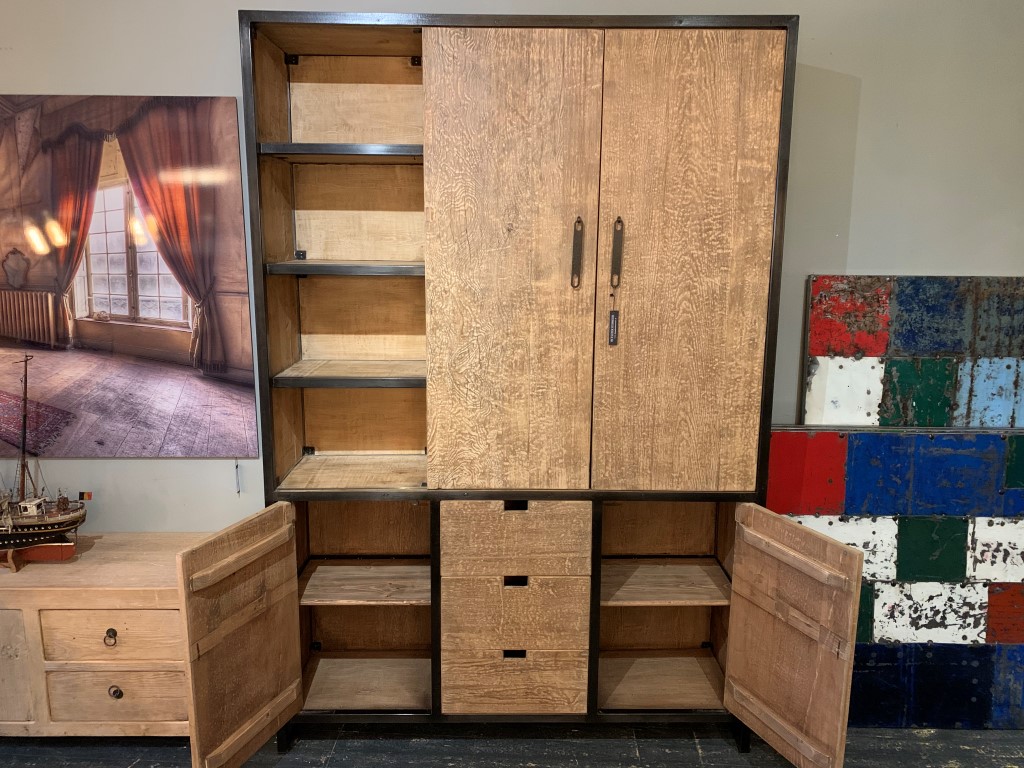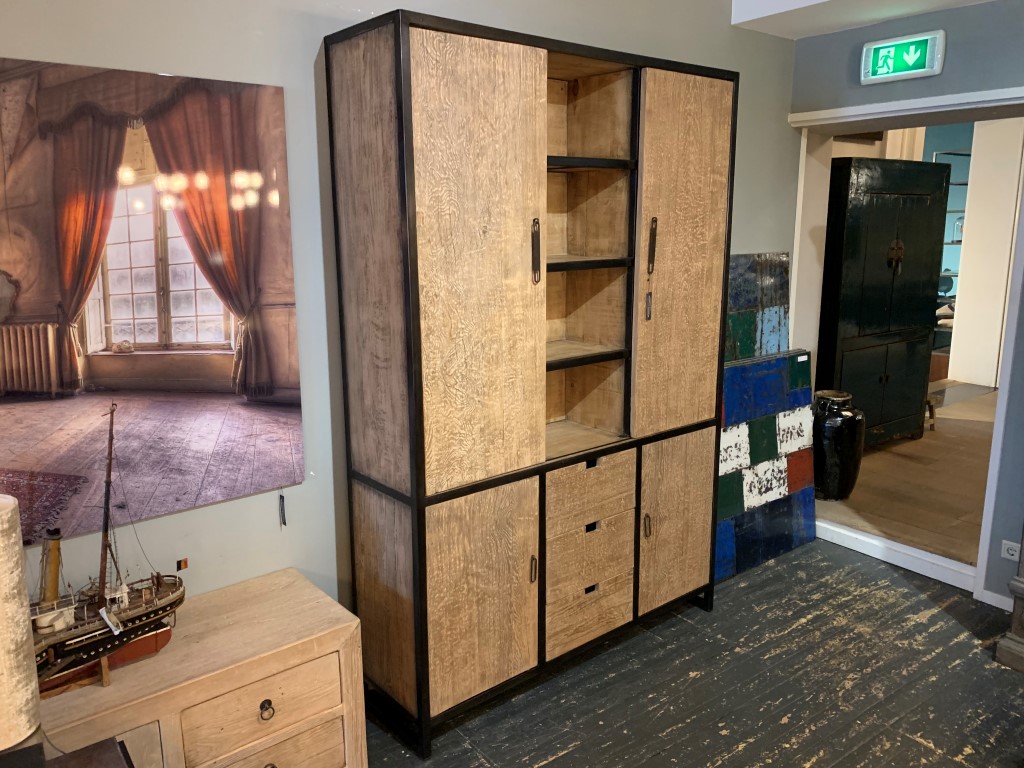Armoire ‘Vienna’ en vieux bois de pin et métal. L’armoire comporte 2 portes coulissantes, 3 tiroirs et 2 portes-patio.