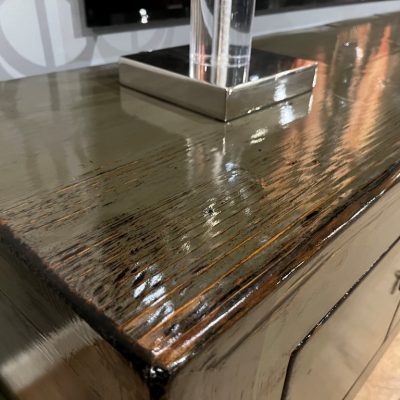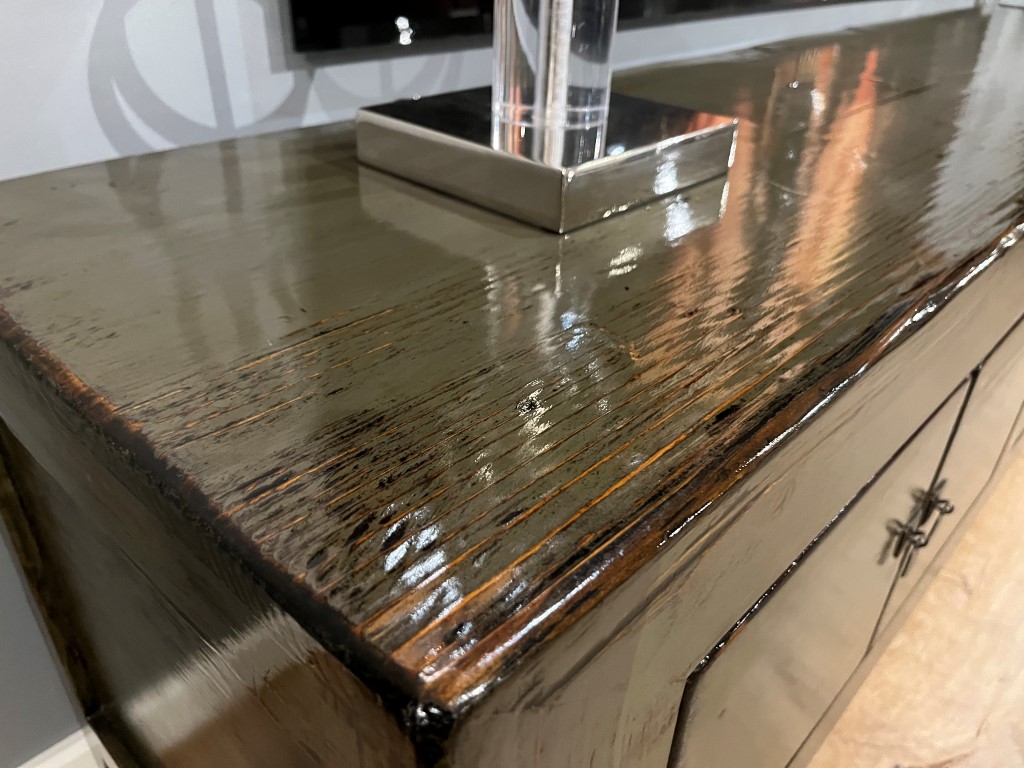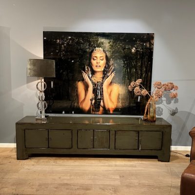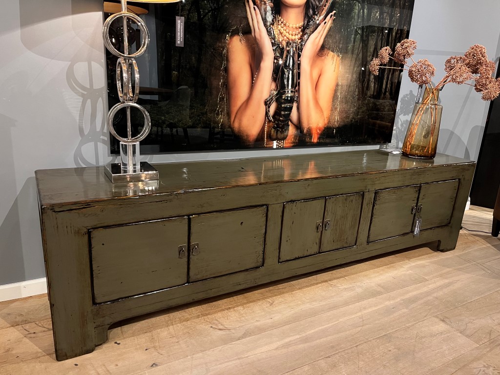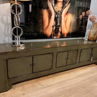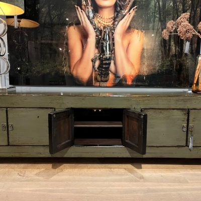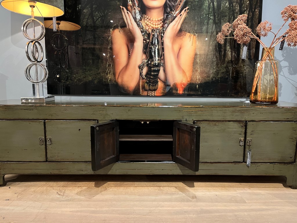 Buffet TV laqué vert ‘Larissa’ à 6 portes, en vieux bois de pin.