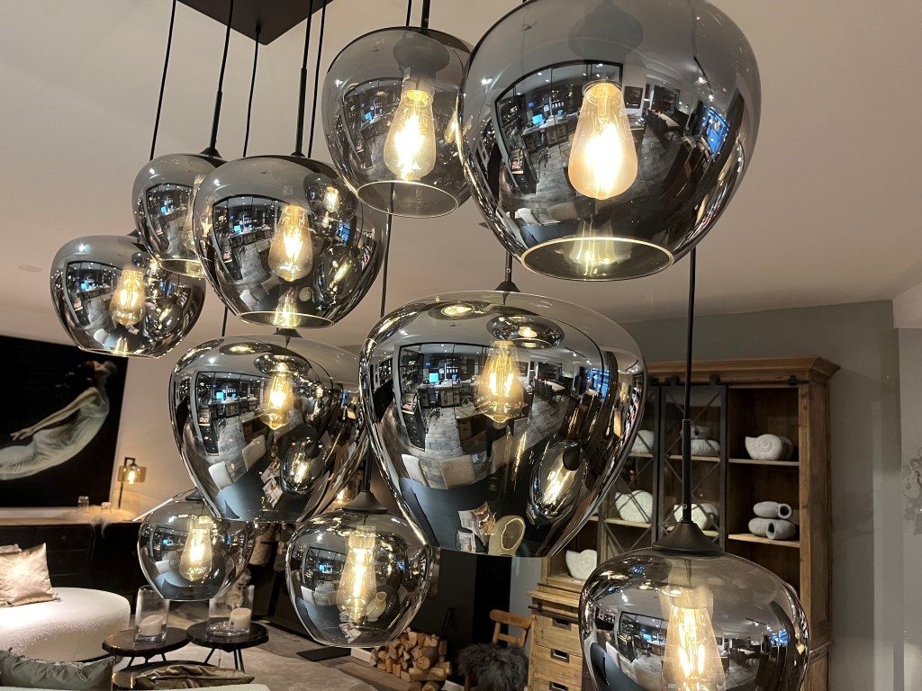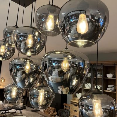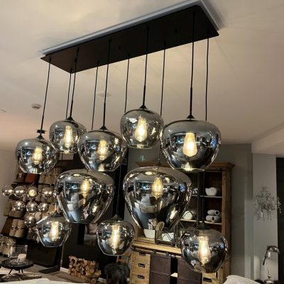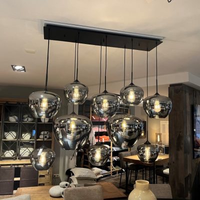 Lampe suspendue ‘Nassau’ avec 10 sources lumineuses dans des ampoules en verre ‘fumée’. La plaque de plafond est en métal. Les cordons de la lampe peuvent être réglés en longueur.