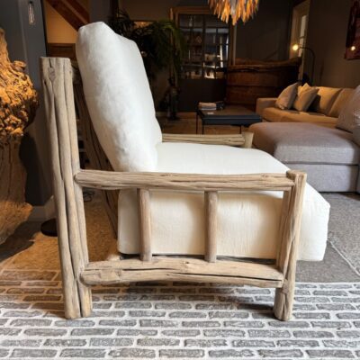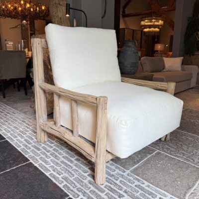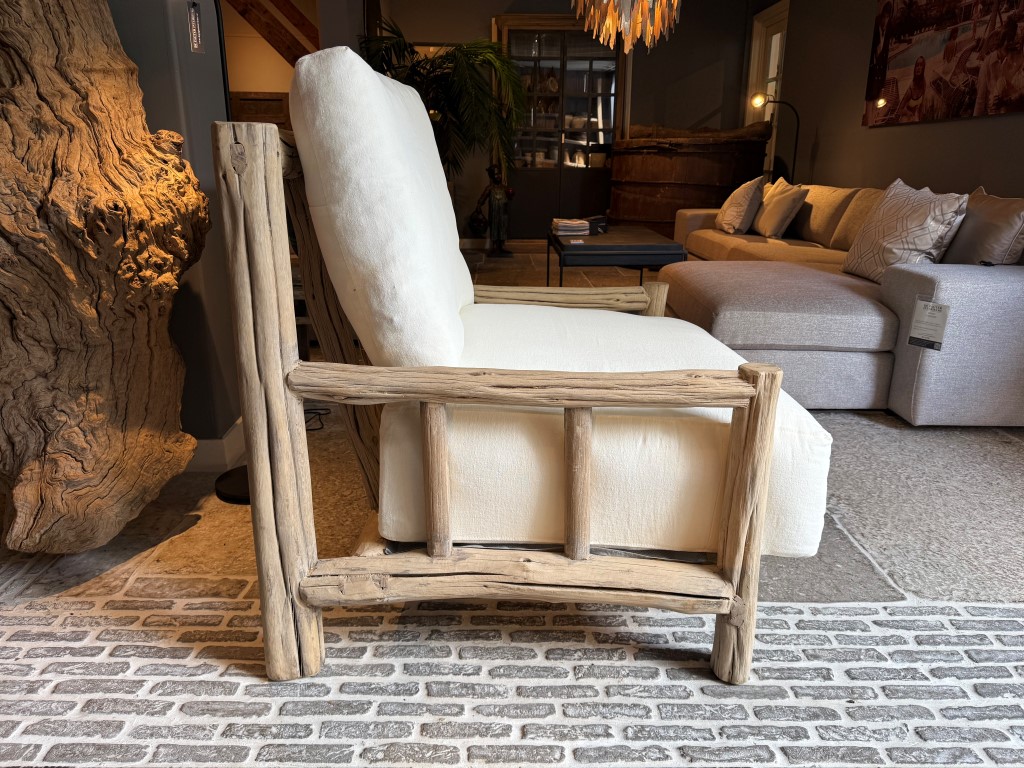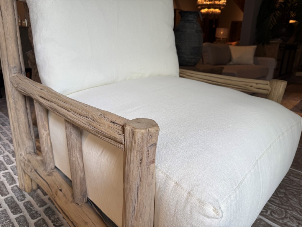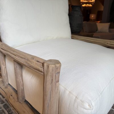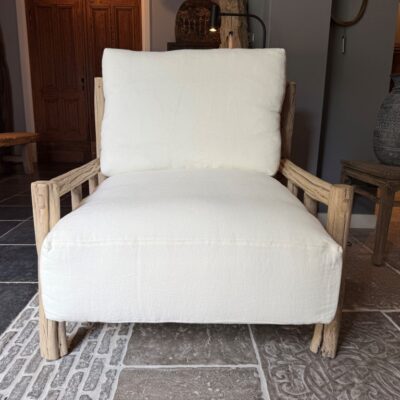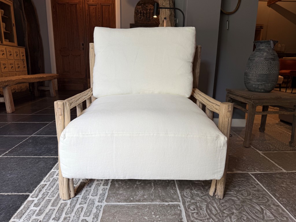 Fauteuil ‘Ibiza’, composé d’un cadre en bois d’orme grossier et d’un coussin d’assise et de dossier en tissu blanc.