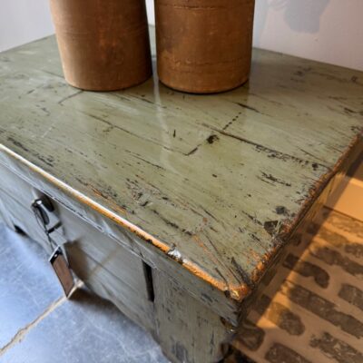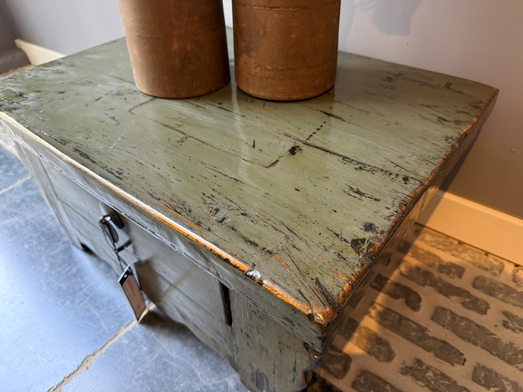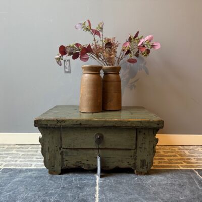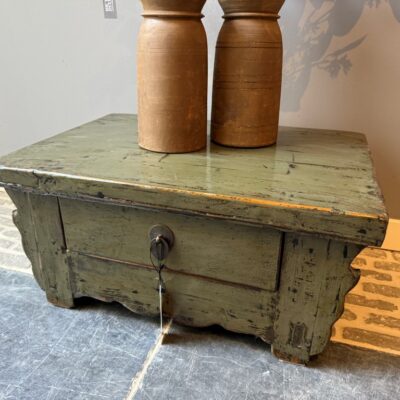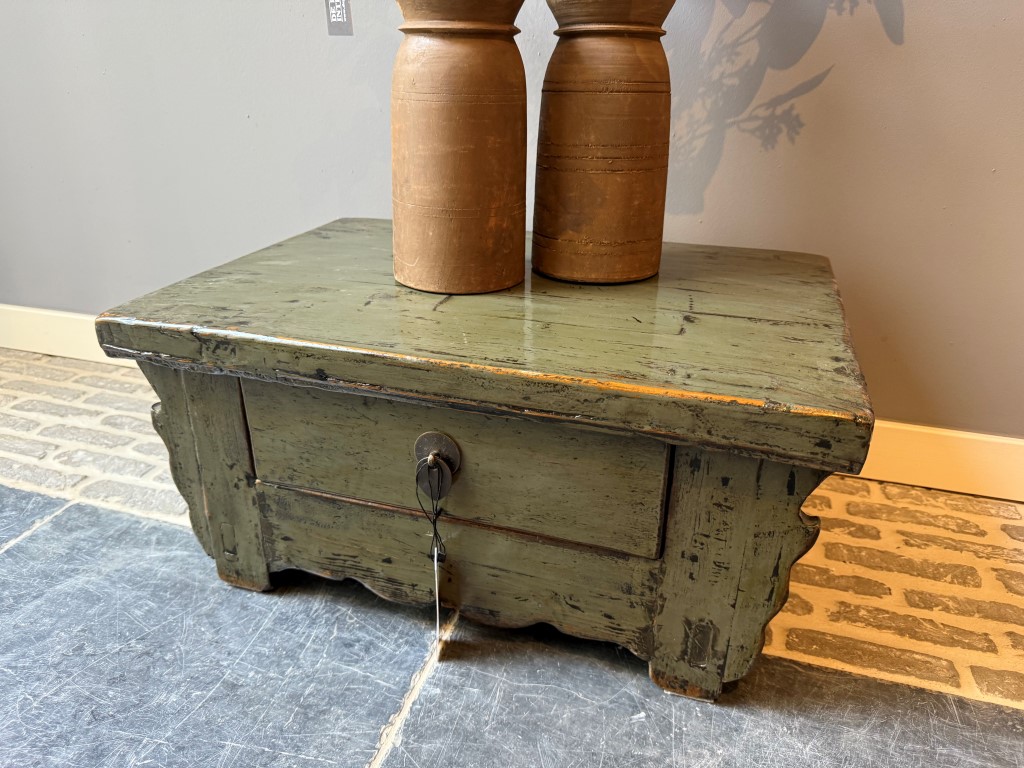 Table d’appoint chinoise ancienne avec 1 tiroir, en vieux bois de pin. La table d’appoint est traitée avec une laque verte.