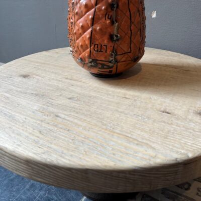Table d’appoint ronde, composée d’un plateau en vieux pin et d’un pied conique en métal.