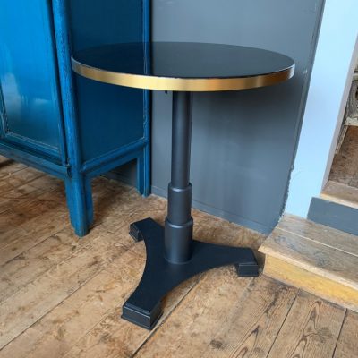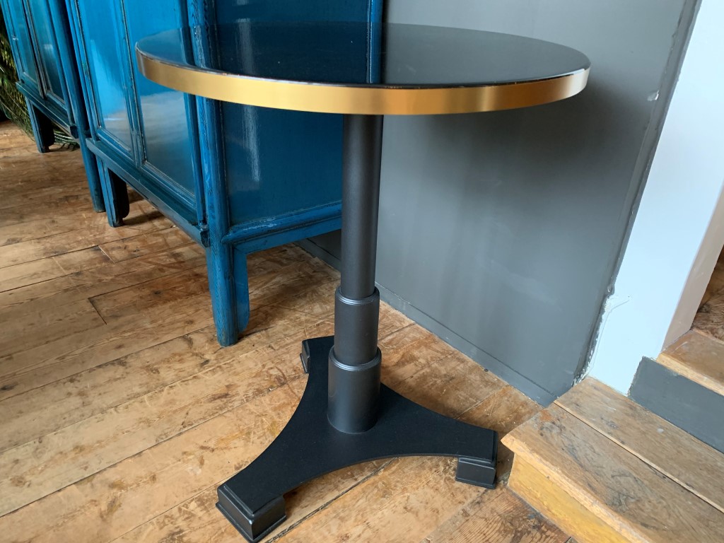 Table ronde ‘Avoria’ de la marque Eichholtz. La table est en métal et en verre.