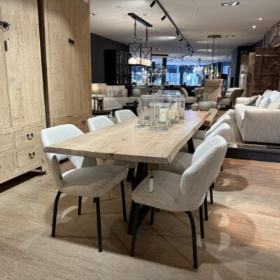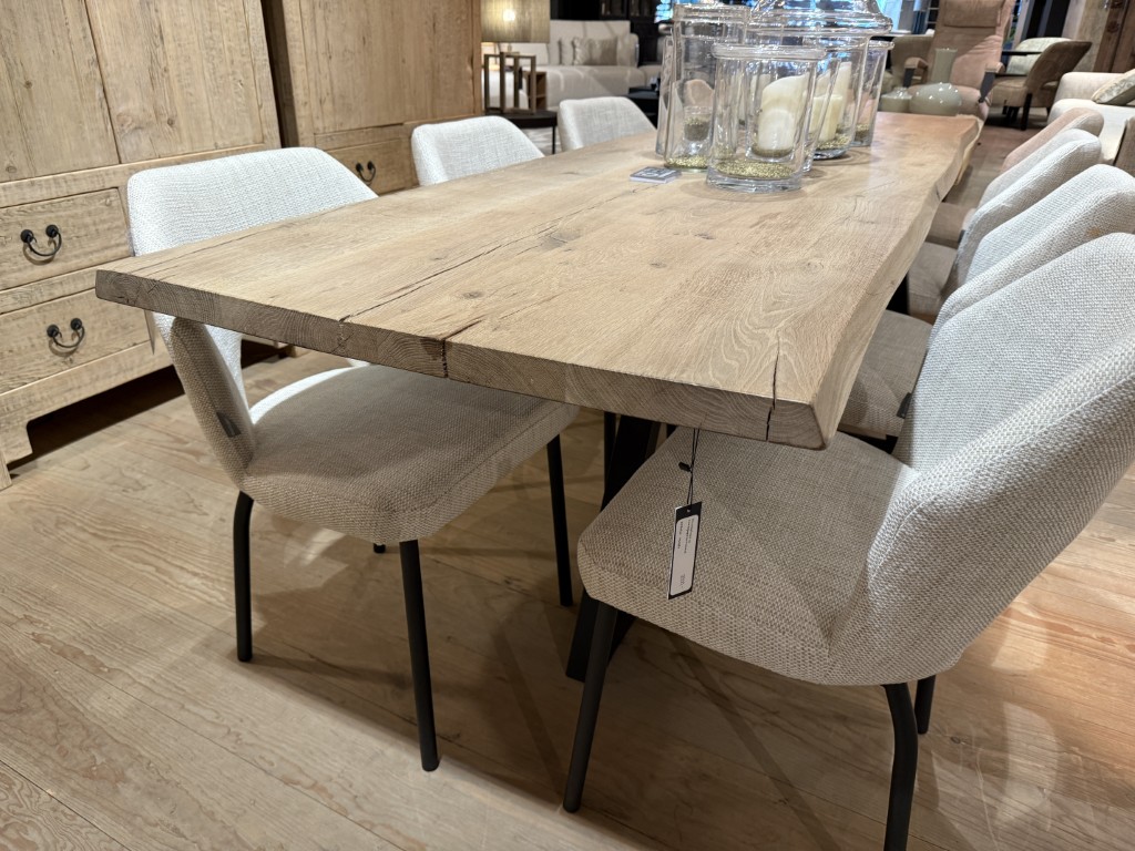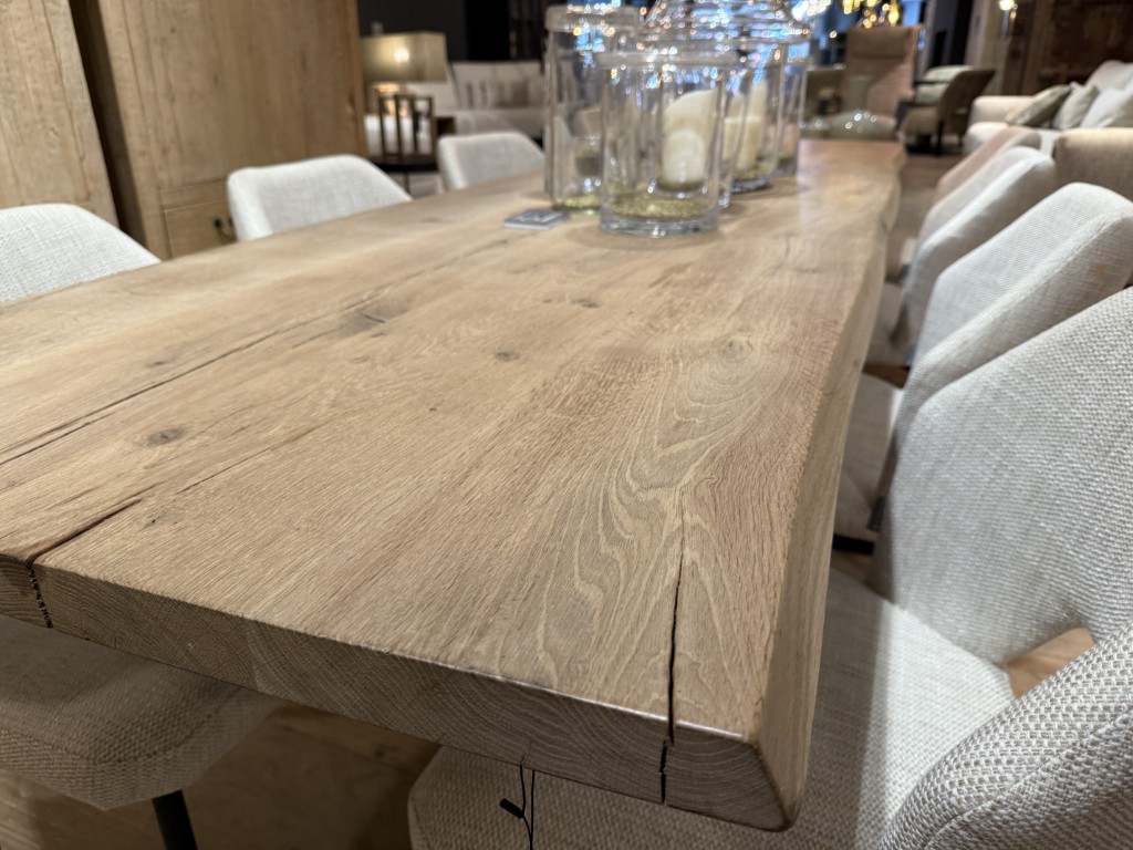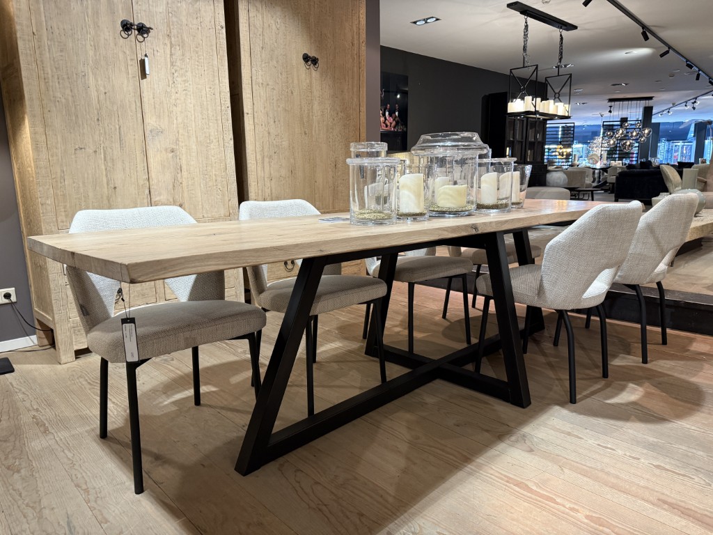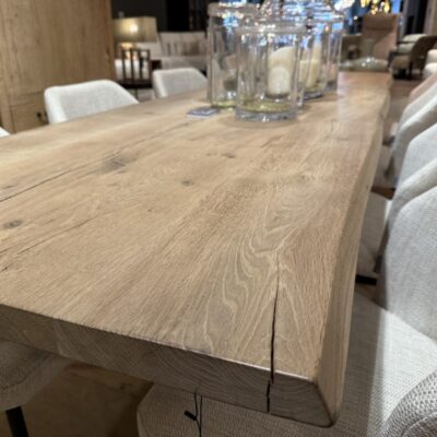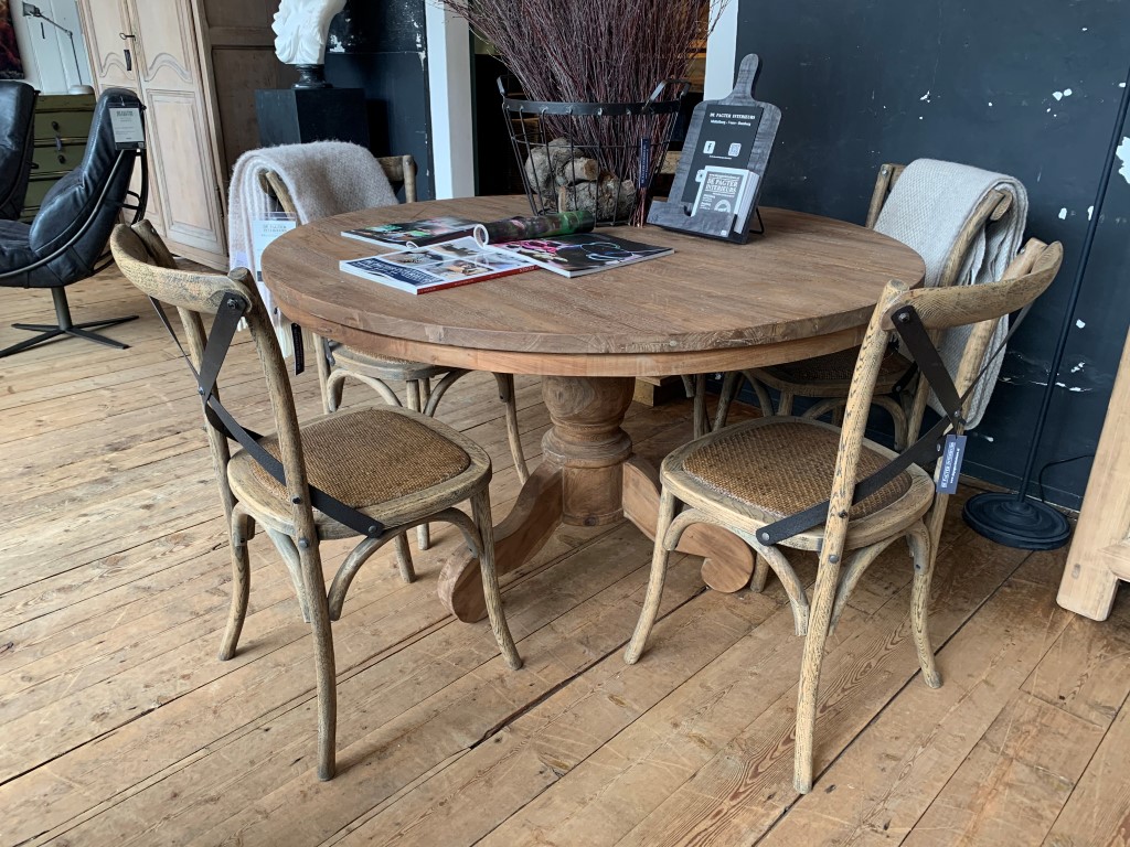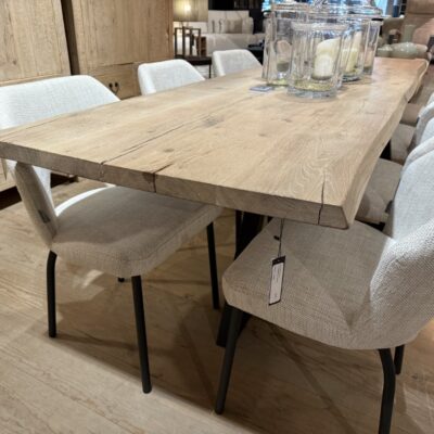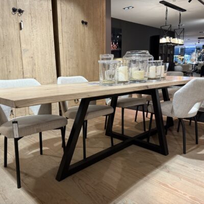 Table à manger, composée d’un plateau en chêne cuit rustique et d’un pied croisé en métal.