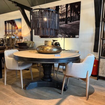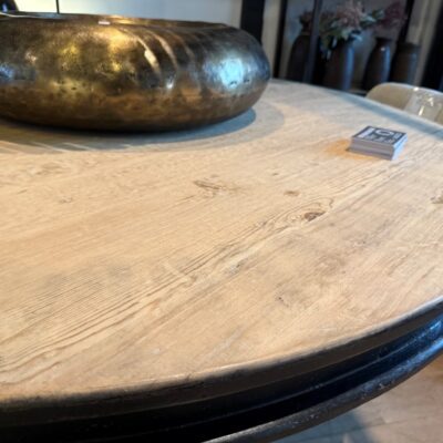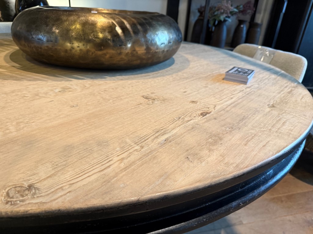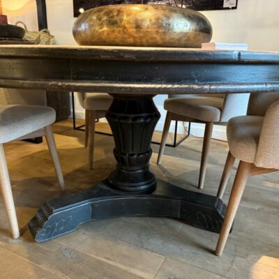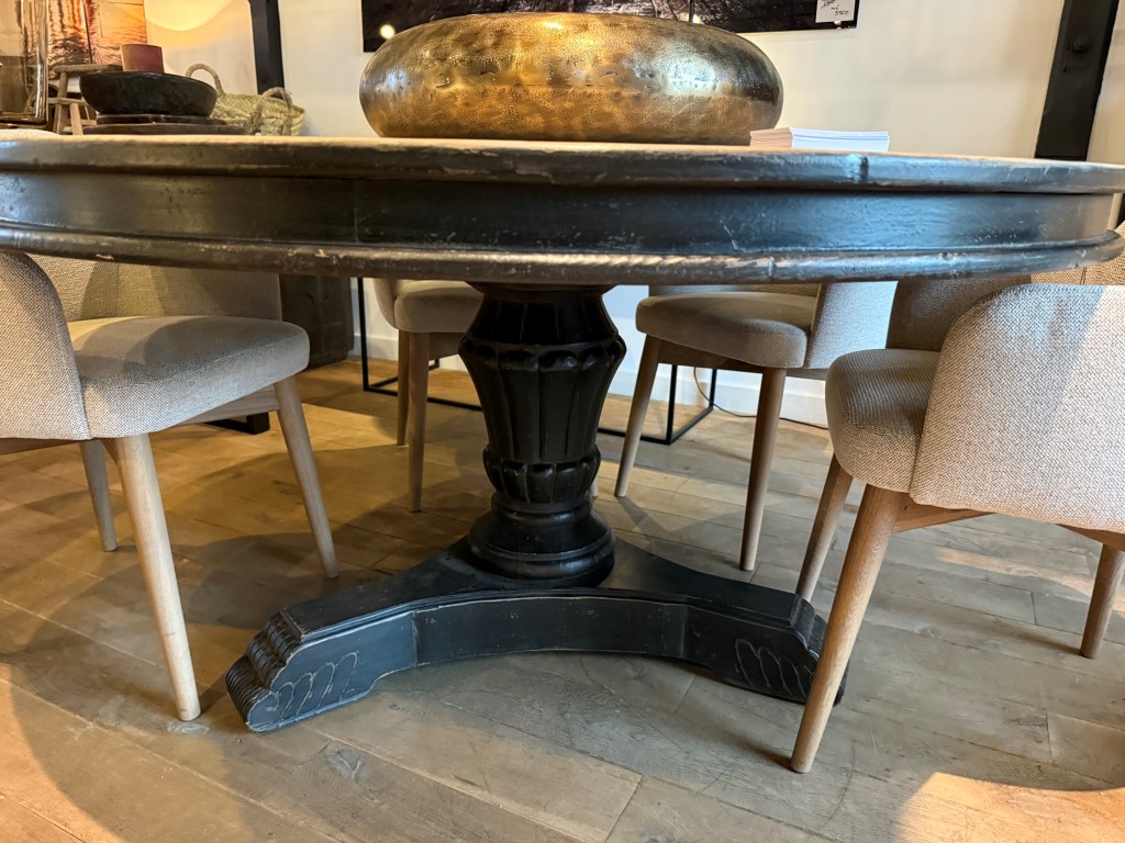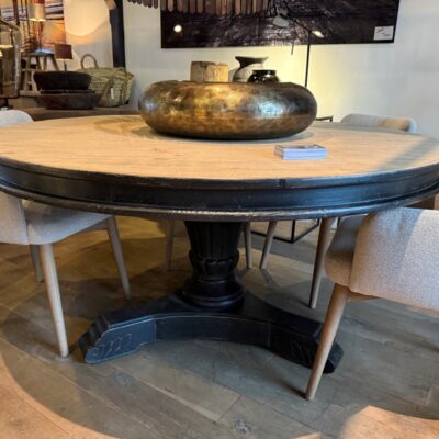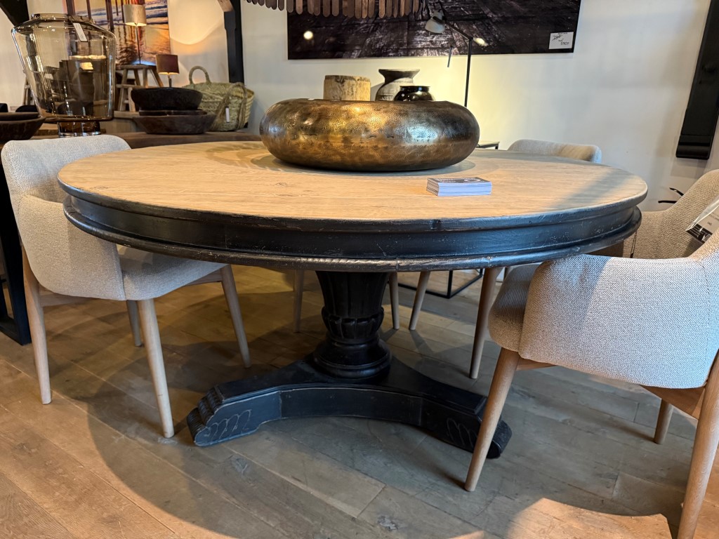 Table ronde rurale ‘Monza’ avec un pied décoratif en bois, en vieux bois de pin. Le pied et le côté du plateau de table sont finis en noir, mais la table est également disponible en blanc.