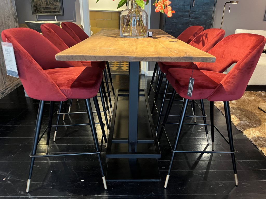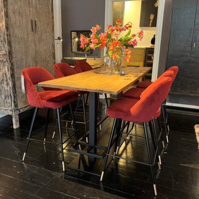 Table de bar mi-hauteur, composée d’un plateau en bois dur et d’une base en métal Goodercoat noir.